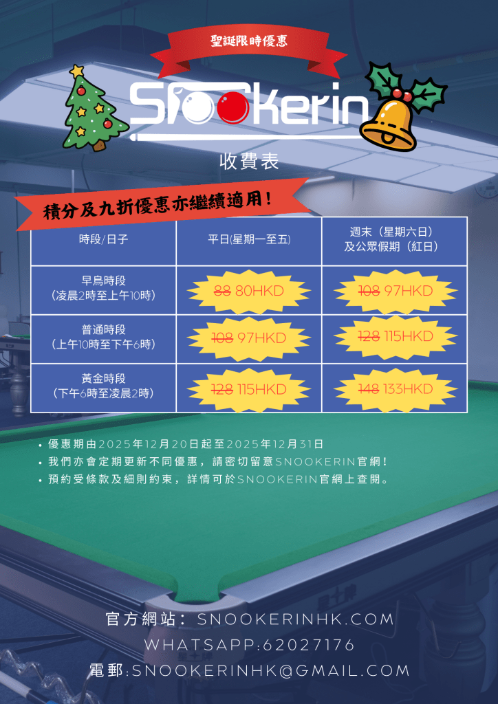 跳至主要內容🎄✨ Snookerin祝大家聖誕快樂呀! ✨🎄 為咗慶祝佳節,我哋特登準備咗聖誕限時優惠,仲唔快啲約埋三五知己一齊上嚟打波切磋!🎱💥